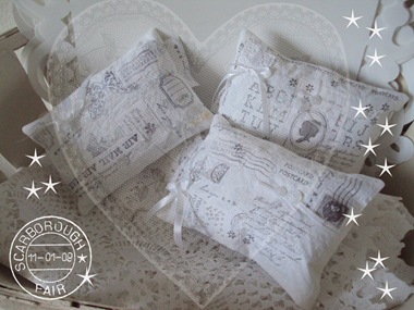 Van witte katoenen stof heb ik ze wel gemaakt voor in de winkel(onder thema’s 2011 en dan gezellig wonen 2).Ze zijn zowel voor als achter en zelfs de binnenkant bestempeld zodat je ze elke keer anders kunt neerleggen of ophangen want er zit een nesteltje in.Je kunt ze vullen met lavendel of zeepjes,of gewoon zo!