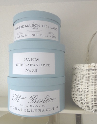 Ik ben er al een tijdje mee bezig…HOEDENDOZEN.Nu.,en paar prototypes verder is dit het geworden.Drie maten dozen die op elkaar te zetten zijn in drie verschillende kleuren.Ze zijn geschilderd met de schitterende kalkverf van L’AUTHENTIQUE.Ik heb gekozen voor poederkleuren blauw,roze en matwit.Op de bovenste foto,twee grote en een kleine doos.